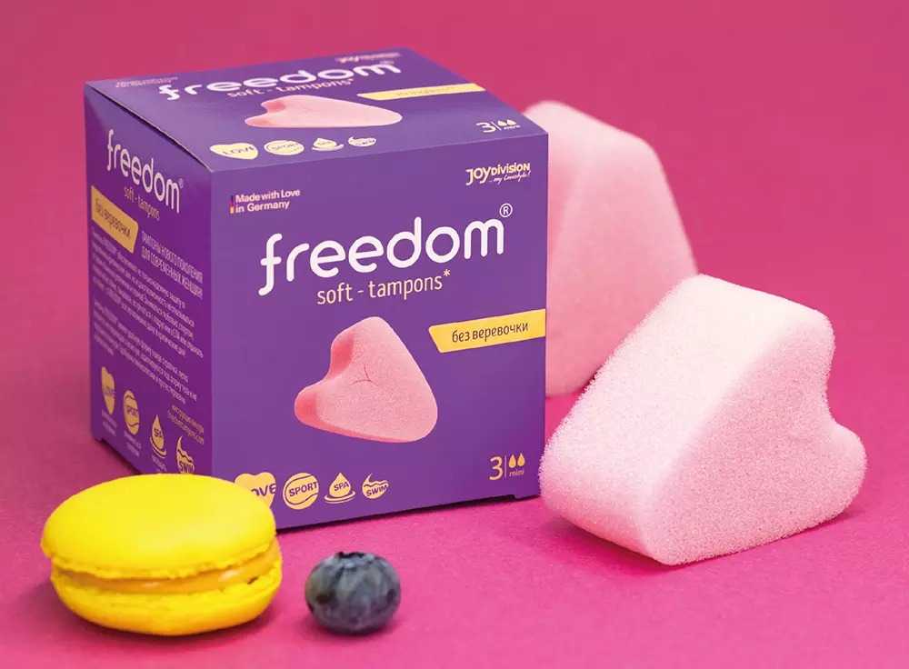 Для облегчения жизни женщин в период месячных давно созданы различные гигиенические средства, которые дарят максимальный комфорт, не ограничивая и не сковывая движений и желаний. К уникальным новинкам в данной категории мы бы отнесли мягкие тампоны-губки без веревочки Freedom от немецкого производителя JoyDivision. Благодаря мягкому материалу тампоны совершенно не ощущаются внутри тела и позволяют заниматься во время месячных любыми привычными делами — плавать, тренироваться и даже предаваться любви. Freedom гипоаллергенны и рекомендованы к использованию ведущими гинекологами.