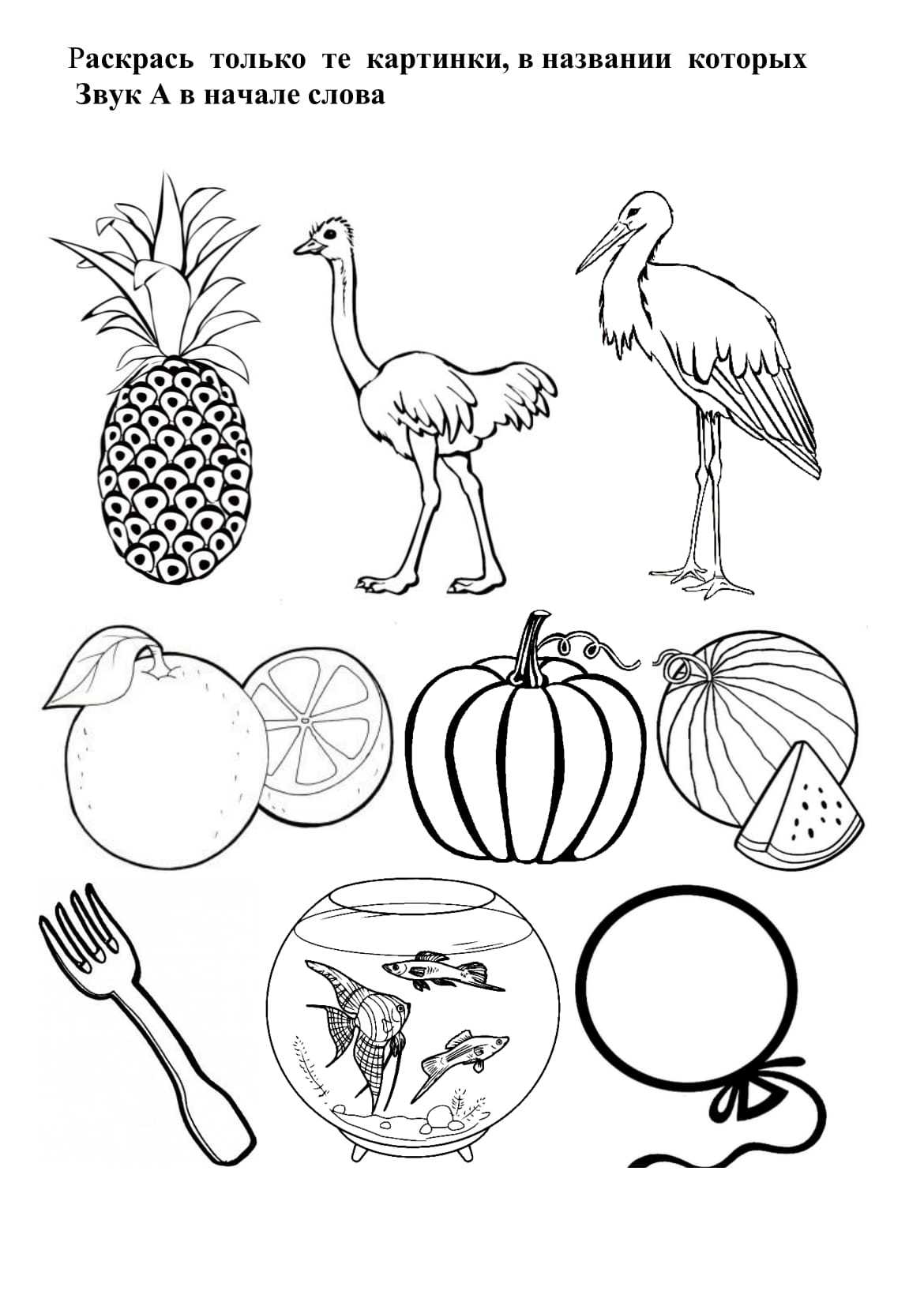 Найди и раскрась только те картинки, в названии которых звук А в начале слова (развитие фонематического слуха).
