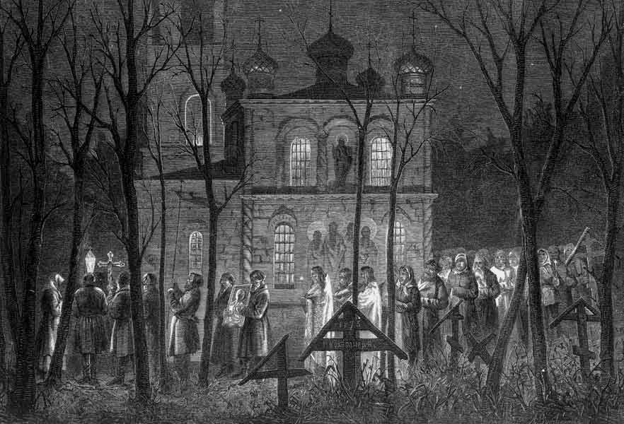 Писатель описывает светлый праздник пасхального воскресенья с щемящей болью: немногочисленные ряды представителей духовенства и верующих в окружении “ревущей молодости” — грубой, хамоватой, полупьяной, но зачем-то присоединяющейся к шествию — ради смеха, развлечения или еще по какой-то неведомой причине.