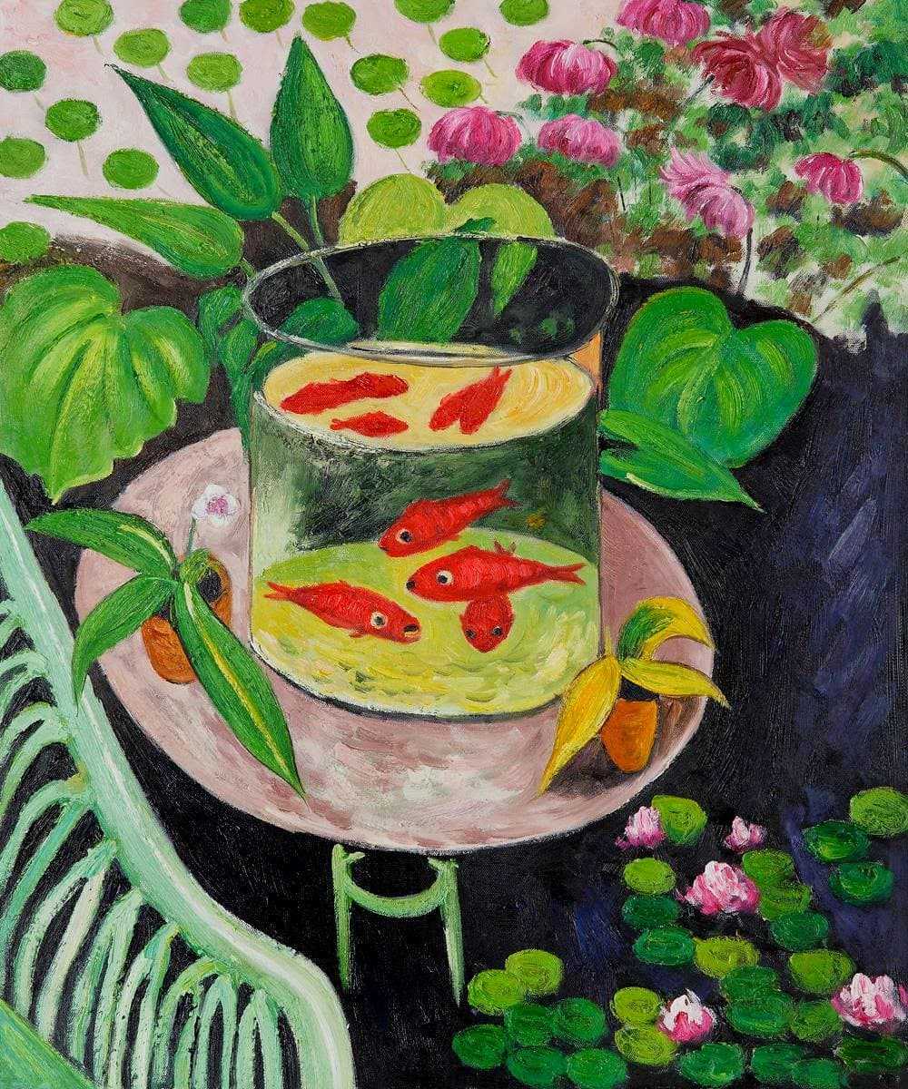 Сокращая пространство до пределов, Анри Матисс изображает на холсте круглый стол с рыбками в аквариуме. Кажется, что рыбки двигаются, плывут одна за другой. Растения тоже выглядят оживленными. Фоном для картины служит сад, а центральная роль достается столу и рыбкам. Отражение рыбок в воде было несложно изобразить расплывчатыми пятнами. Стол изображен на картине так, будто бы художник рисует его сверху, но ножка, пририсованная к нему, в то же время создает ощущение, что рисование происходило сбоку. В картине преобладает круглая фигура, что задает полотну определенный ритм и вызывает умиротворение.