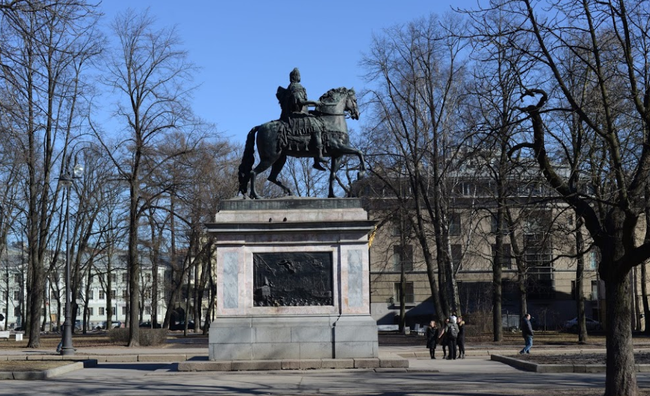К 1747 г. бронзовый конный памятник Петра I перед Михайловским замком в Санкт-Петербурге был, наконец, завершён, хотя скульптор Карло Растрелли изготовил модель памятника ещё при жизни Петра I. Ещё около 50 лет рассматривались разные места для установки памятника. А сам он всё это время оставался под деревянным навесом у Троицкого моста.Окончательно возведён на пьедестал памятник был только в 1800 г. Пьедестал был изготовлен по рисунку российского архитектора Фёдора Волкова. Гранитный пьедестал облицован олонецким мрамором белого, розового и зеленоватого оттенков и украшен двумя бронзовыми барельефами: «Полтавская баталия» и «Битва при Гангуте», а также аллегорической композицией с трофеями. Барельефы исполнены скульпторами И. И. Теребенёвым, В. И. Демут-Малиновским, И. Е. Моисеевым под руководством М. И. Козловского. По приказу императора Павла I на пьедестале была сделана надпись «Прадеду – правнук».