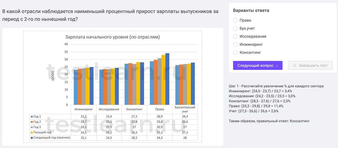 В рамках теста, который длится 6 минут, кандидату будут представлены различные диаграммы с вариантами ответов. Сопоставив графическую информацию, нужно выбрать правильный вариант. По сути, это самый легкий компонент теста, так как он не требует математических вычислений и глубокого текстового анализа. Сложность представляет именно ограничение во времени, которое оказывает стрессовое давление на потенциального сотрудника и проверяет его способность быстро принимать взвешенные решения в напряженной обстановке.