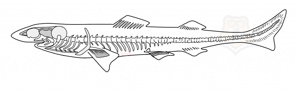 - Тело покрыто плакоидной чешуей (она гомологична, т.е. схожа по строению и происхождению с зубами позвоночных, состоит из дентина, сверху покрыта эмалью). Голова с боков не прикрыта жаберными крышками, а открывается просто жаберными щелями.