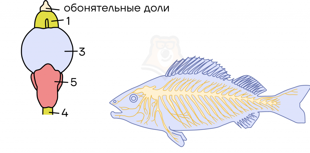 5 — мозжечка (наиболее хорошо развит у рыб, т.к. отвечает за координацию в пространстве).