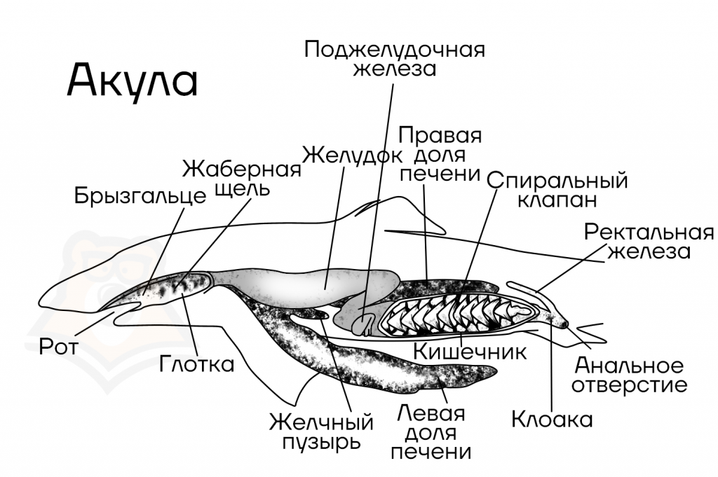 Запоминаем: рот → глотка → пищевод → желудок → кишечник → клоака.