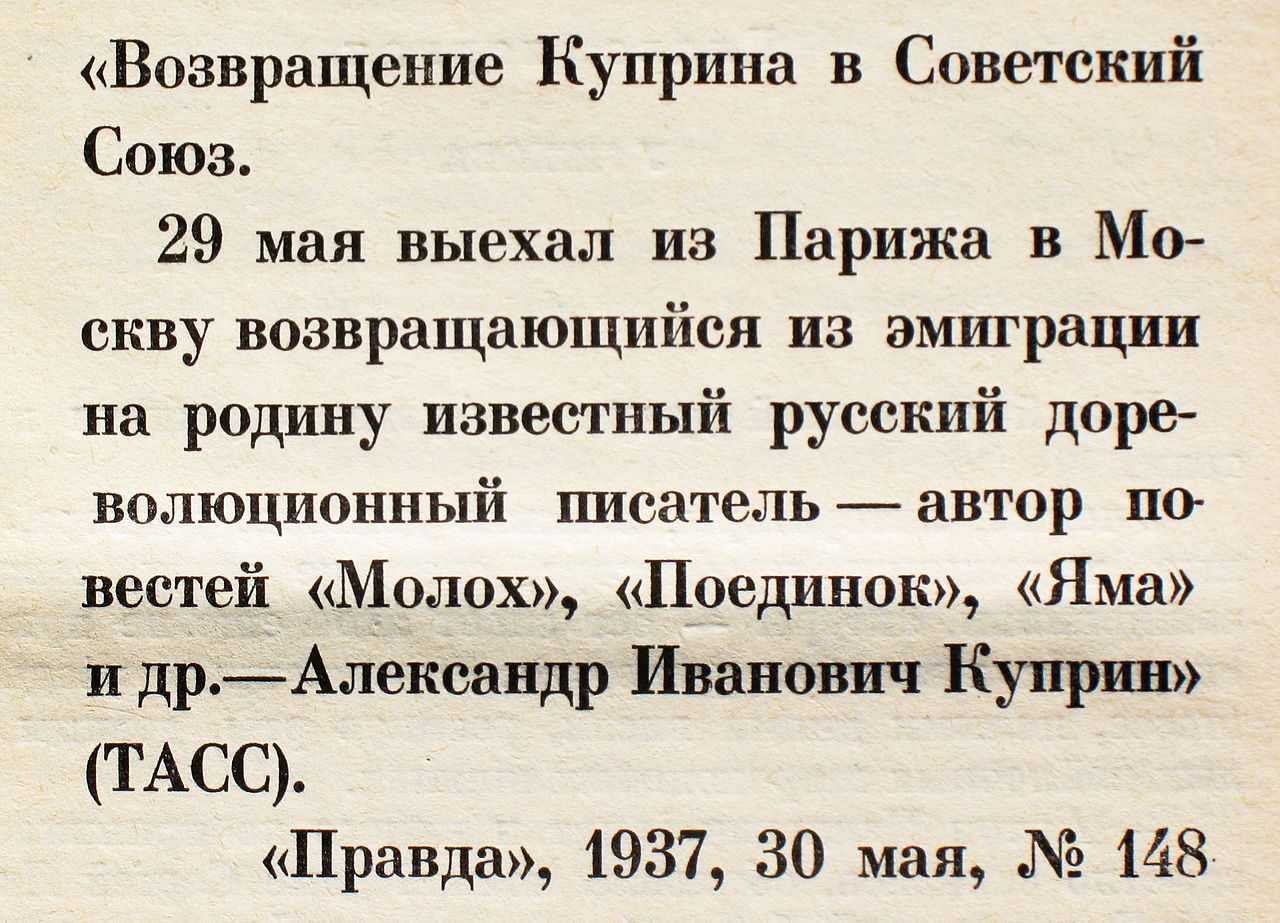 О возвращении Куприна в СССР, 1937 год, «Правда»