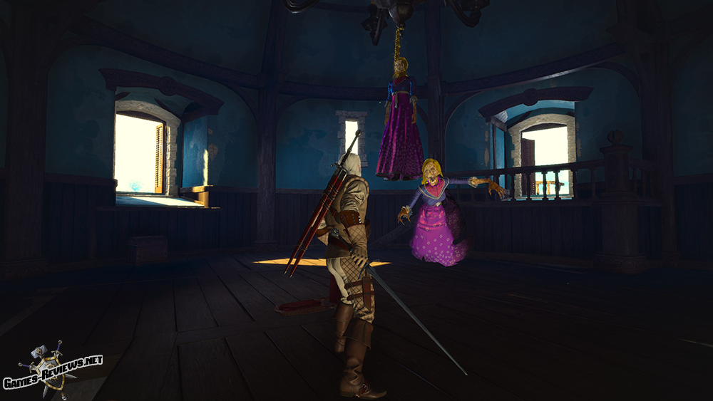 Уже в башне окажется, что Рапунцель не предрасположена к диалогу… Ещё бы, ведь мёртвые не разговаривают. Когда герцогские дочери выросли, а Страна Тысячи Сказок одичала, Долговласка, к которой так и не приехал принц, настрадавшись от одиночества, решила повеситься на собственной косе. После смерти её привидение поселилось в башне и встретило ведьмака криком «Слишком поздно!», после чего без промедления набросилась на припозднившегося посетителя. Призрак Рапунцель не стоит воспринимать как Полуденницу/Полуночницу с изменённой моделью, поскольку кроме причины возникновения и уязвимости к маслу против призраков их ничего не объединяет. Долговласка не способна принимать нематериальную форму, но потеряв треть здоровья, она закричит и вселится в собственное тело, постепенно восстанавливая здоровье; Геральт не сможет прекратить этот процесс до тех пор, пока не разделается с призванными ею волшебными скелетами. Они даже слабее обычных разбойников, но их много, так что если вы не поторопитесь, то рискуете позволить горюющему духу вернуться в бой полным сил. Отмечу, что скелеты, как ни странно, не обладают иммунитетом к кровотечению, возгоранию и отравлению, так что используя Танцующую Звезду в сочетании со Сном Дракона, взрывающиеся арбалетные болты и знак Игни, уничтожение скелетов станет делом нескольких секунд. Рапунцель, как одиночную цель, рекомендуется зажать в углу и прессовать Вихрем, периодически попивая Гром (немного усиливает урон от атак). Победив Долговласку, возьмите с её тела стандартный набор любого призрака: лунные осколки, призрачную пыль, эссенцию призрака; а искомый нами жёлтый боб лежит на кровати. И что бы вы не делали, помните: не смотрите под юбку!