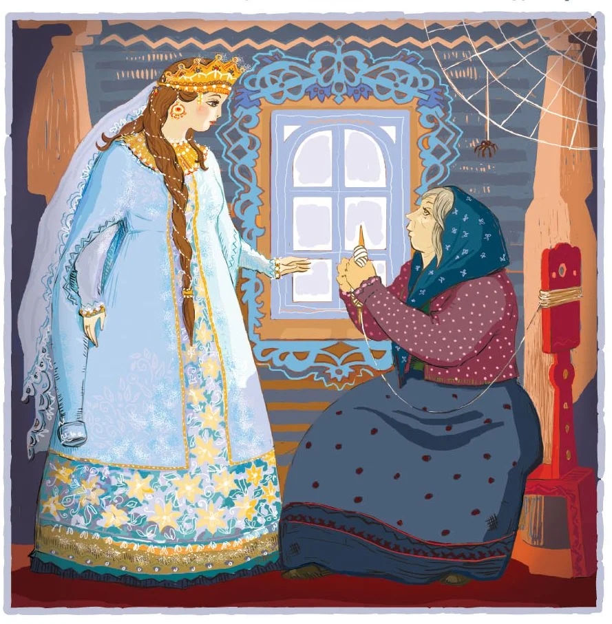 Но время шло, пророчество забылось. И вот однажды царь с царицей отбыли на прогулку, а доченька пошла по дворцовым комнатам гулять. Зашла в богатые палаты, поднялась по винтовой лестнице, а там старушонка сидит, пряжу прядет и песенку поет.