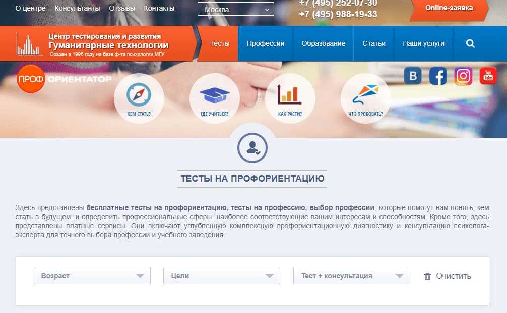 У Центра тестирования и развития «Гуманитарные технологии» на базе факультета психологии МГУ есть сайт, на котором можно пройти множество платных и бесплатных тестов на профориентацию для старшеклассников.